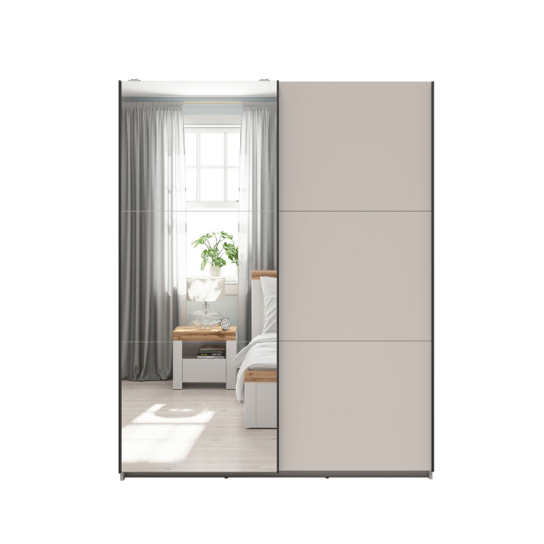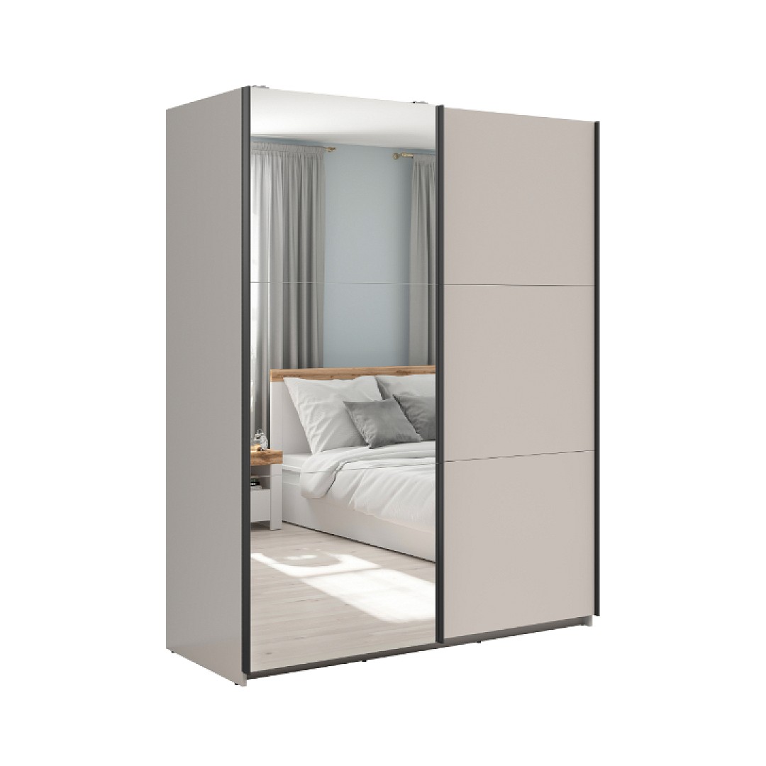 Skříň je vyrobená v barvě kašmír. V nabídce máme k dispozici také další barvy. Vybrat si můžete z barevných variant. Laminovaný povrch je odolný vůči mechanickému opotřebení, snadno se udržuje. Vnitřní prostor je potažený plátnem šedé barvy s jemnou strukturou. Dvířka jsou posuvné a tak šetří místo v prostoru. Součástí je jedno zrcadlo vhodné k projasnění místnosti. Navíc můžete před odchodem z domu okamžitě zkontrolovat, jak vám to sluší. Za dvířky jsou k dispozici šatní tyče a police pro dokonalé organizování vašeho oděvu.