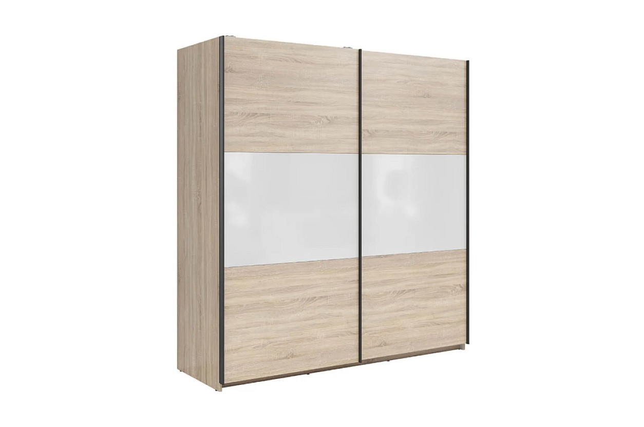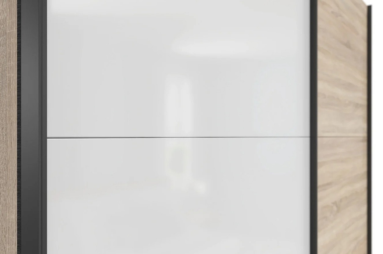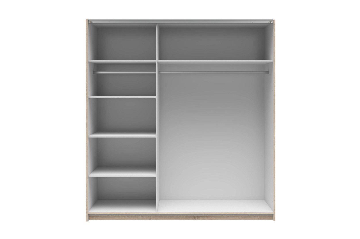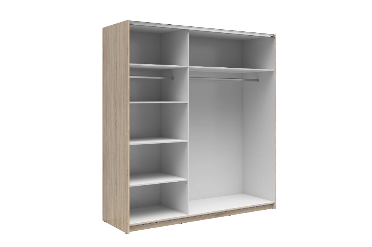 Součástí skříně jsou posuvné dveře, což dodává nábytku moderní design. Barevné provedení je v tónu dub sonoma/bílý lesk. Vnitřek je potažený šedým plátnem s jemnou strukturou.