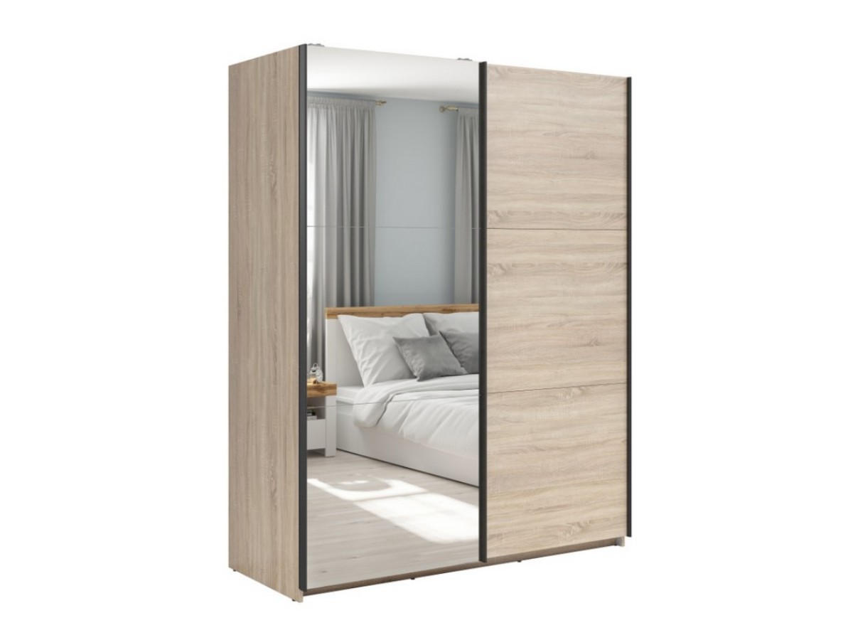 Vyrobena byla z lamina, které se snadno udržuje. Barevné provedení je v tónu dub sonoma. Navíc máte možnost vybrat si tuto skříň také v dalších barvách. Vnitřek skříně je potažený šedým plátnem.