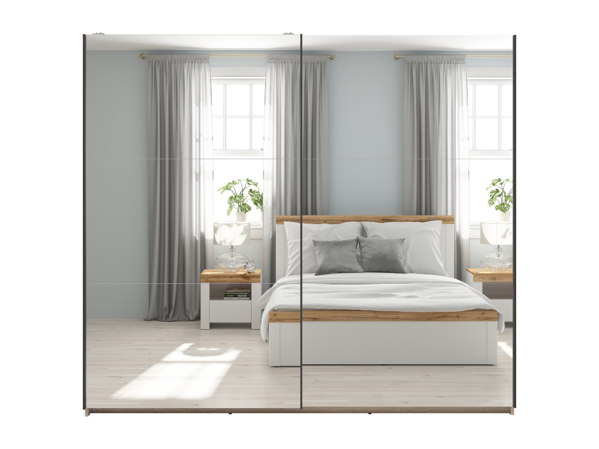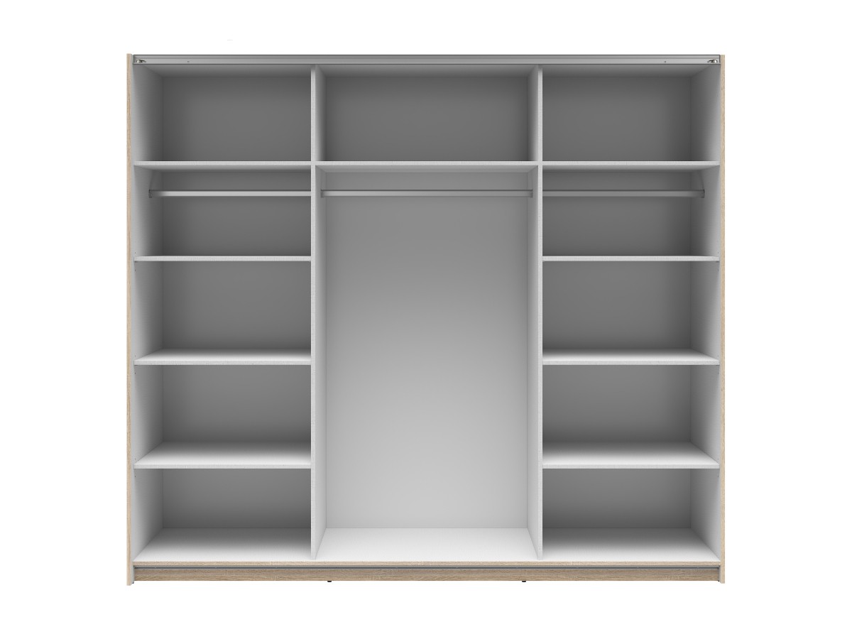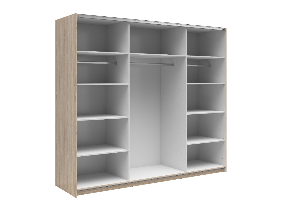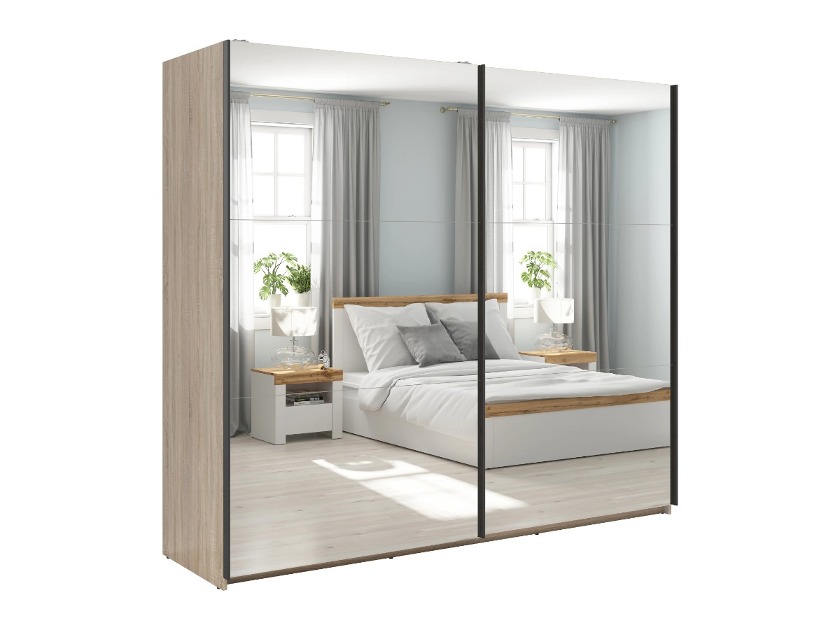 Součástí skříně jsou posuvné dvířka se zrcadly, což dodává nábytku moderní design. Barevné provedení je v tónu dub sonoma. Tento tón je velice oblíbenou součástí domovů. Vnitřek je poté potažený šedým plátnem s jemnou strukturou.