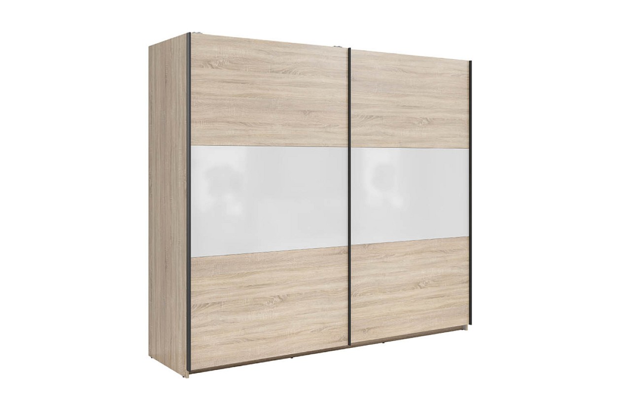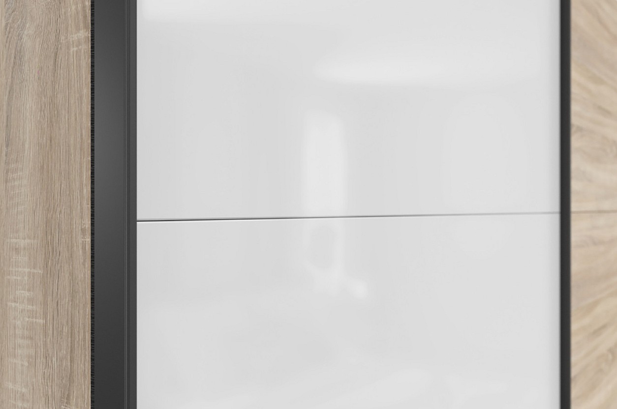 Materiál - lamino, které se snadno udržuje. Jeho barevné provedení je v tónů dub sonoma/bílý lesk. V nabídce také další barvy viz barevné varianty. Vnitřek skříně je potažený plátnem v šedém tónu.
