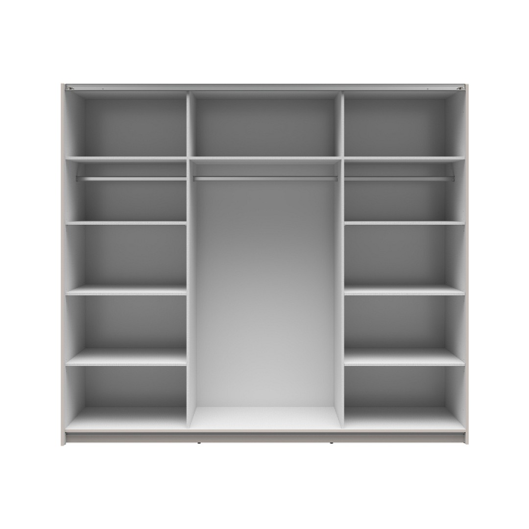 Hlavní předností této skříně jsou posuvné dveře, které šetří místo v prostoru a dodávají celkovému vzhledu místnosti uklizený vzhled. Zrcadlová část na dveřích zvětšuje a projasňuje prostor. Vnitřek skříně je potažený šedým plátnem. Barva korpusu a dveří je v tónu kašmír. V nabídce také další barvy viz barevné varianty.