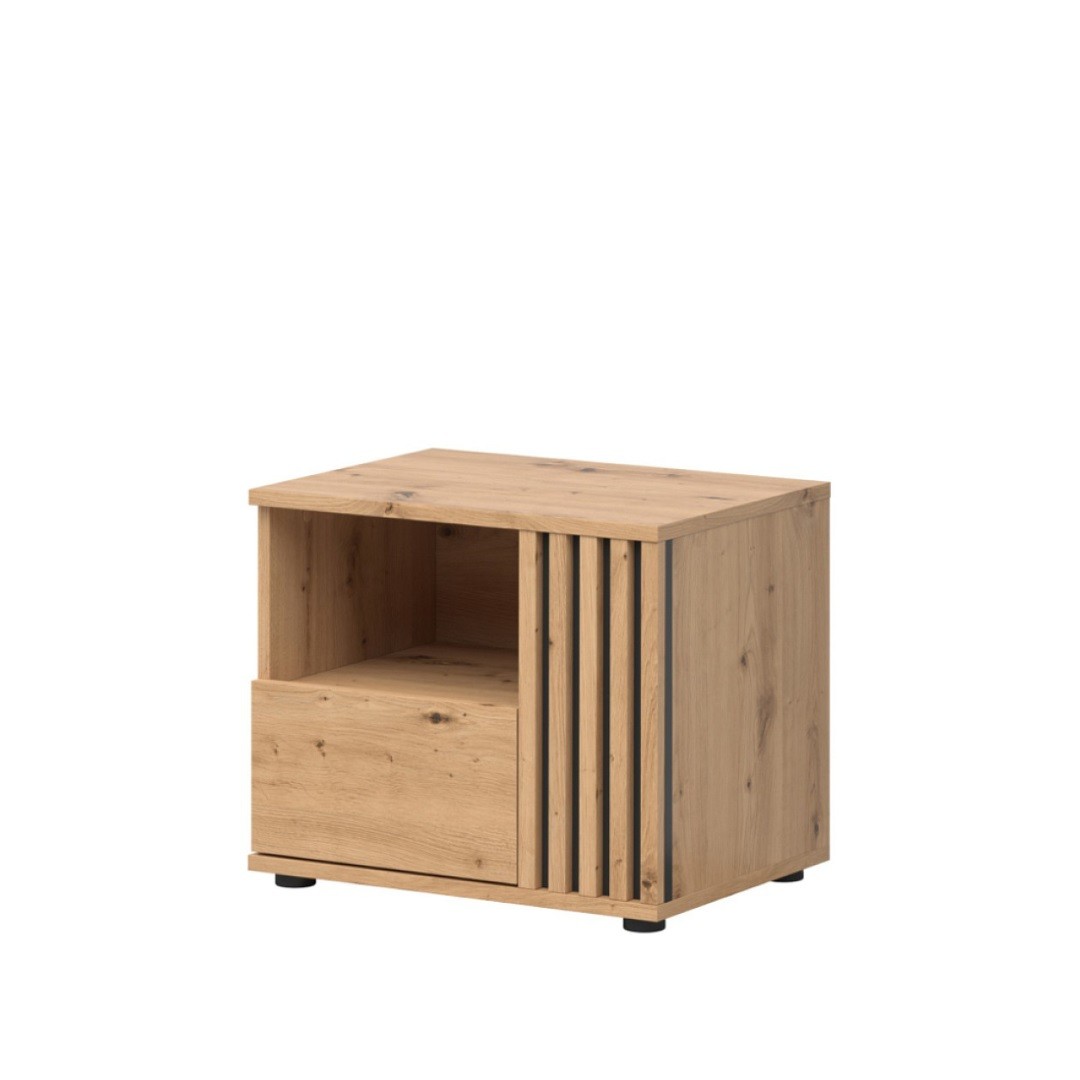 Noční stolek VABRES KOM1S/P nabízí prostor pro odložení vašich nezbytností, které toužíte mít při spánku po ruce. Nabízí prostor pro umístění lampičky, ale také okrasné květiny. Barevné provedení je v kombinaci tónů dub artisan/černá. ..