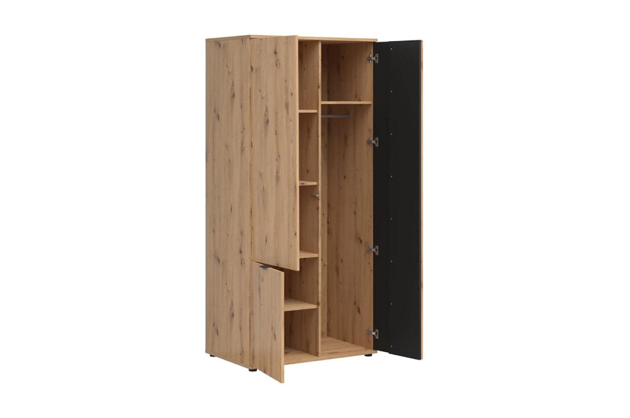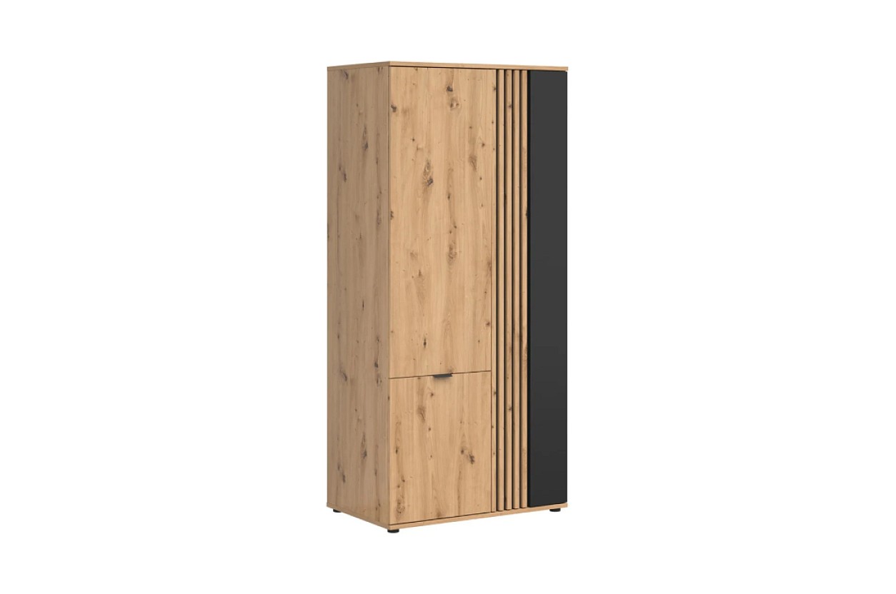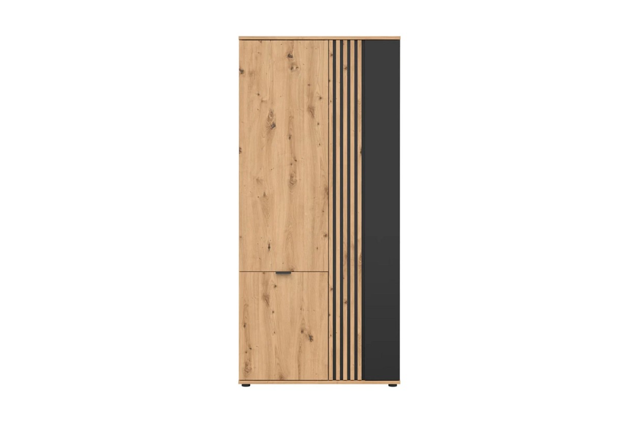 VABRES je vyrobena z lamina + MDF. Kombinace barev dub artisan/černá. Uvnitř skříně se nachází šatní tyč a police. Toto rozvržení zajistí snadný přehled v ukládaných věcech. Levá vrchní část dvířek se otevírá snadno díky push to open systému. Push to open je praktický systém otevírání nábytku, kde stačí jemně zatlačit na dvířka nebo zásuvku, a ty se samy otevřou. Zajišťuje minimalistický, moderní design.