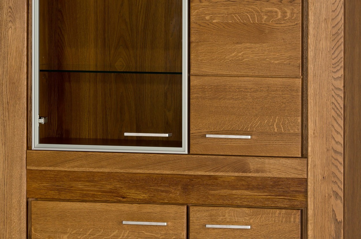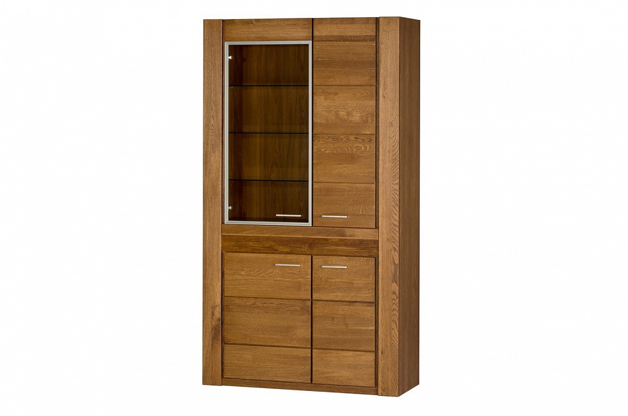 Vitrína VANCOUVER je vyrobená z kvalitního masivního dřeva v barvě dub rustikal. Za prosklenými dvířky se skrývají prosklené police, za plnými dvířky pak laminové police.