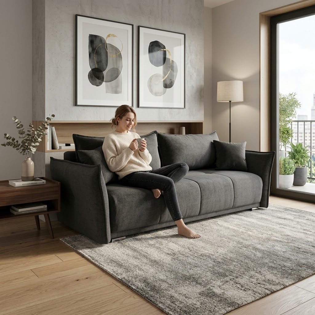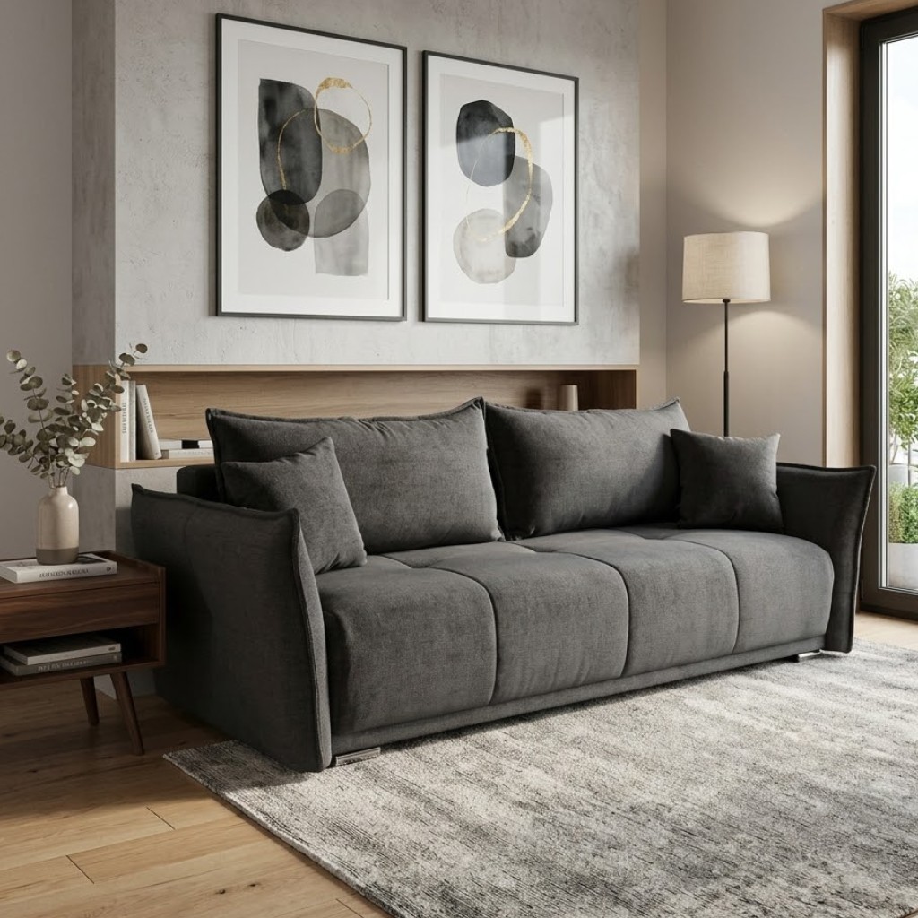 Pohodlná rozkládací pohovka VANESSA se stane praktickým doplňkem vaší domácnosti. Pohovka je třímístná a disponuje velkým úložným prostorem. Barevné provedení tmavě šedá - Sorella 88. Hrubá látka odolná proti žmolkování...