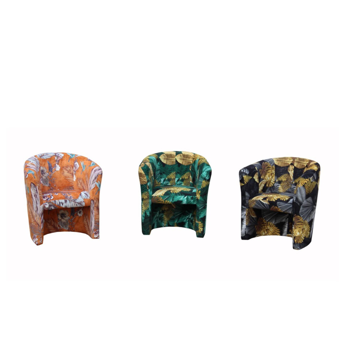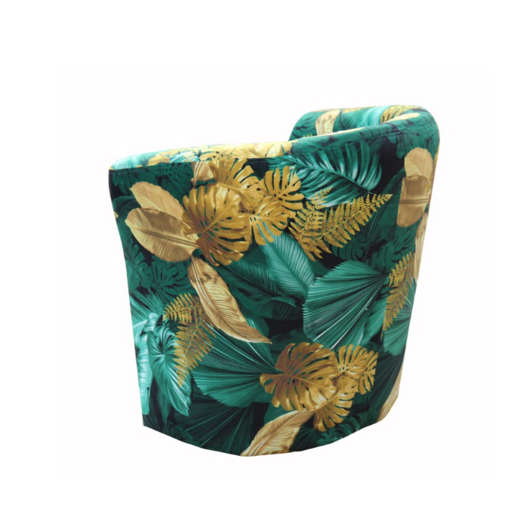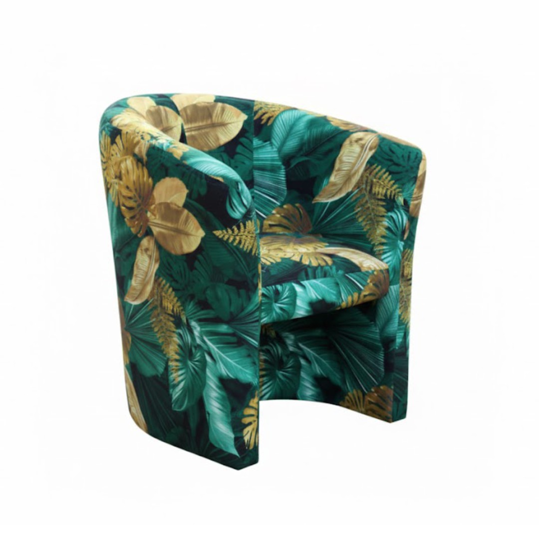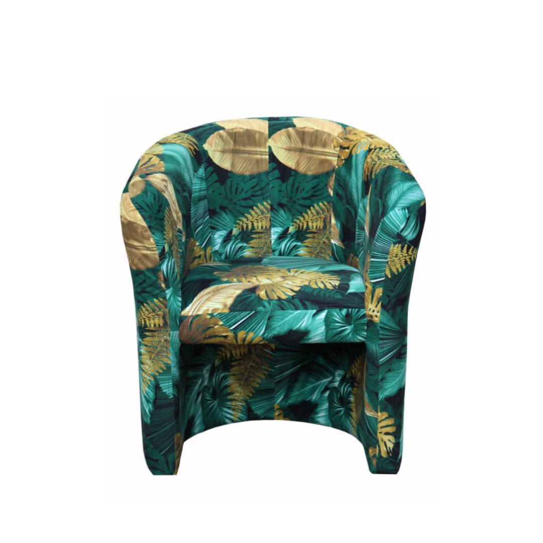 Vyrobeno je v krásné vzorované látce v odstínech tmavě zelená - žlutá (KA12609). Hlavním motivem na potahu jsou velké listy rostlin.
