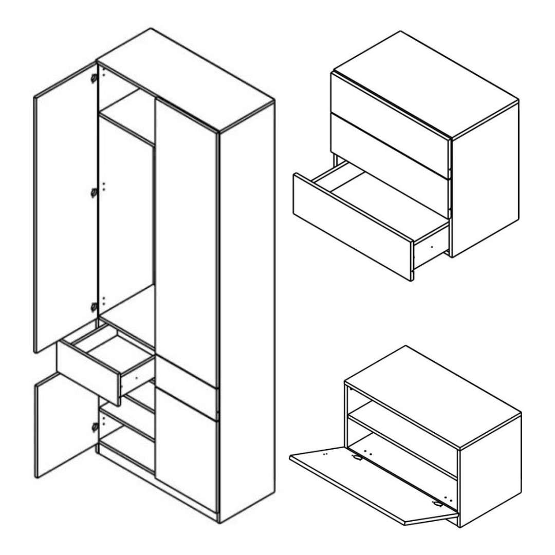 Součástí stěny VERONIKA je botník s výklopem - udržuje pořádek v ukládané obuvi. Uvnitř botníku je k dispozici police, která pomáhá přehledně rozdělit prostor pro obuv. Dále je k dispozici šatní skříň mající ve vrchní části polici, pod ní výsuvnou šatní tyč - ideální pro zavěšení kabátů. Uprostřed skříně jsou šuplíky, vhodné pro uložení drobností + 2 police dole. V sestavě naleznete také věšákový panel, zrcadlo a závěsnou komodu.