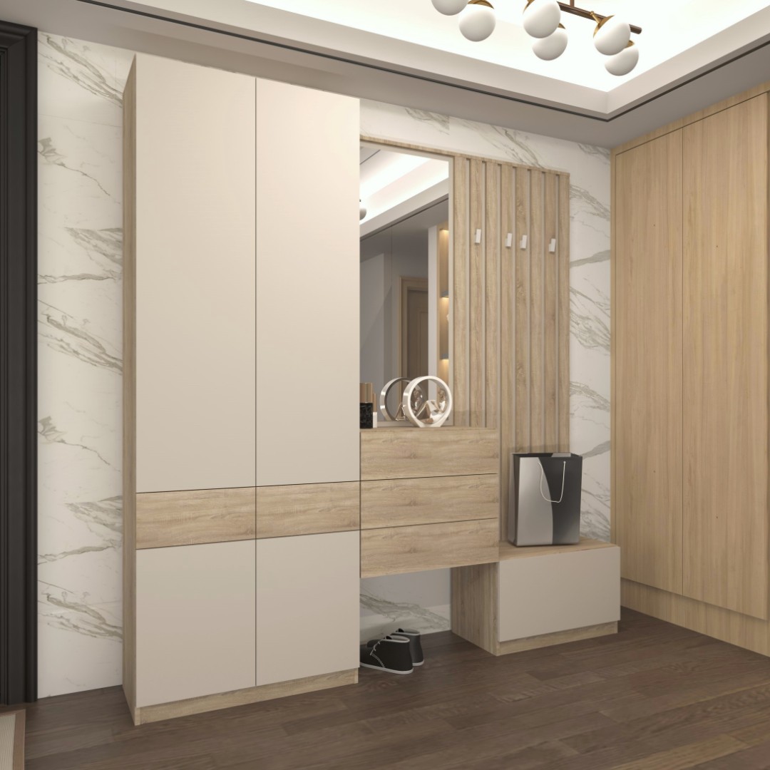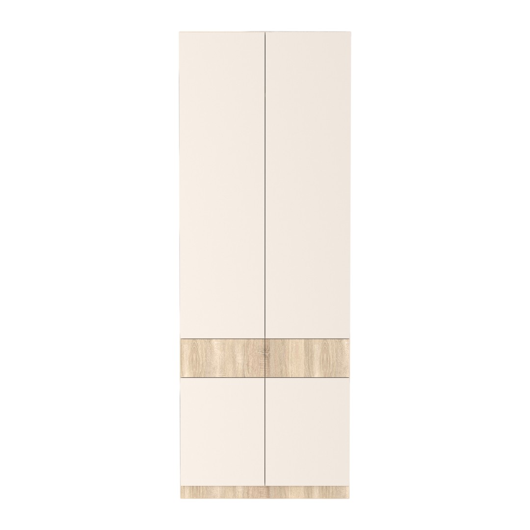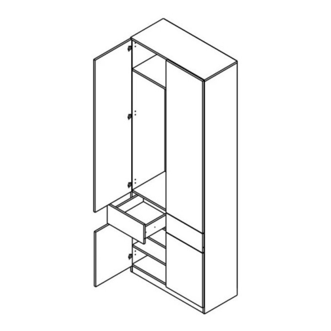 Vyrobena je z lamina. Vnitřní členění šatní skříně bylo navrženo s ohledem na každodenní používání. V horní části najdete polici, ideální pro odkládání méně používaných věcí či sezónních doplňků. Pod ní je umístěna výsuvná šatní tyč, která nabízí praktické a pohodlné zavěšení kabátů, bund a dalšího oblečení. Dva šuplíky umístěné uprostřed skříně poskytují přehledné místo na rukavice, šály, klíče nebo jiné drobnosti. Spodní část má k dispozici dvě police, které poslouží například pro uložení obuvi či tašek.