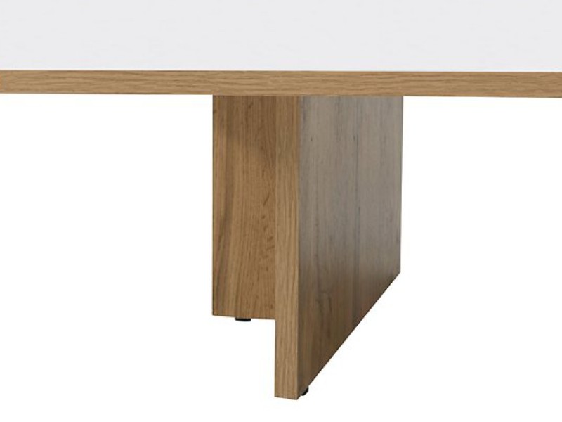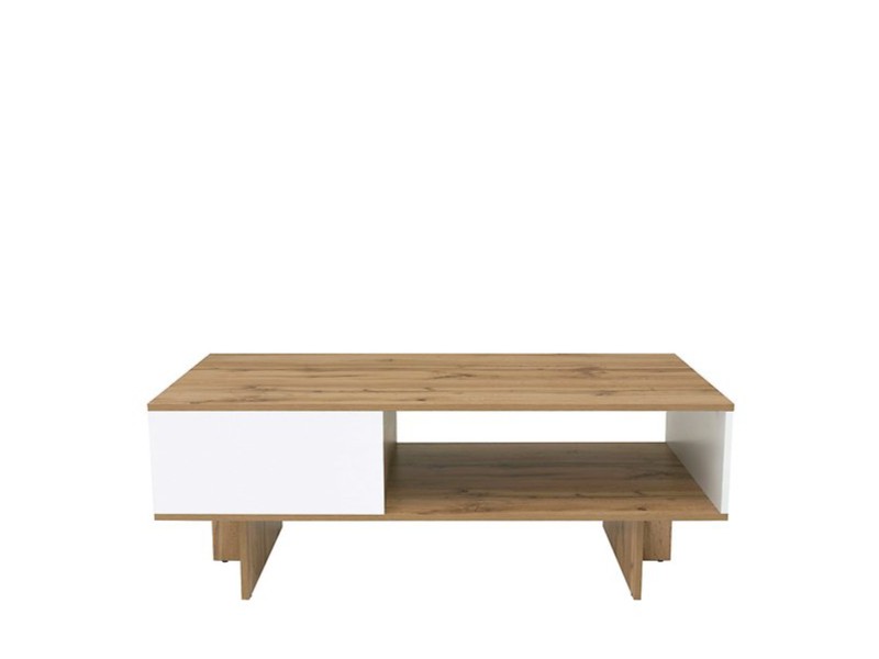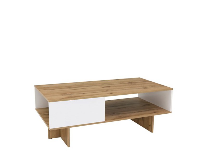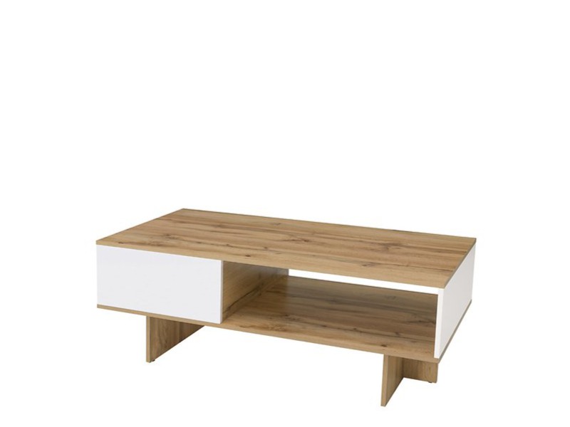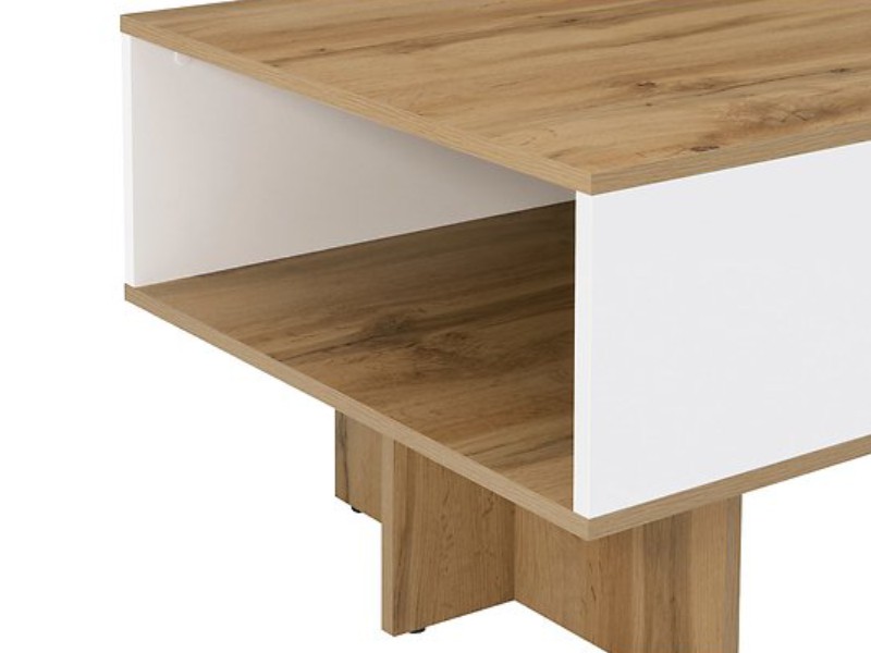 K výrobě stolku bylo použito lamino ve dvou kontrastních, ale plně ladících barvách. Dřevěný dekor Dub wotan je stylově doplněn bílým leskem. Prostorná odkládací police snadno najde své využití.