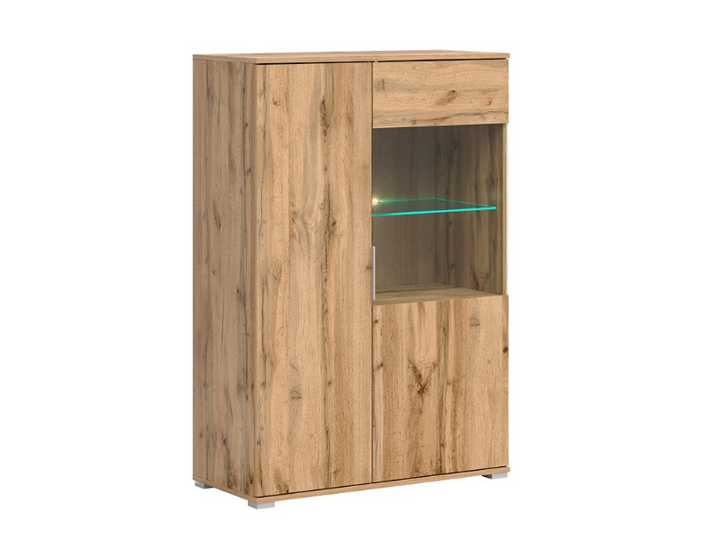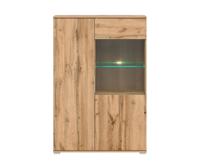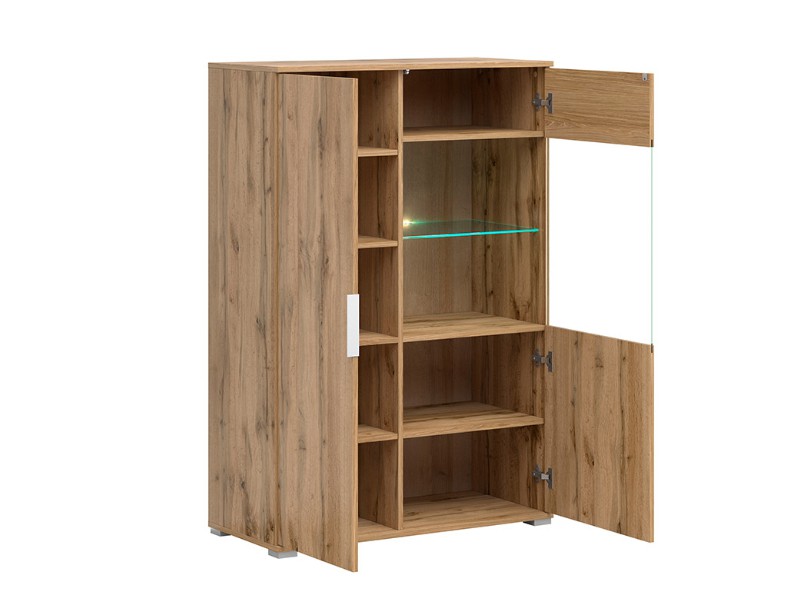 Plná dvířka se otevírají pomocí nenápadné úchytky z tvrzeného plastu ve stříbrné barvě. Prosklená dvířka jsou opatřena tzv. push-to-open systémem. Skleněnou polici můžete doplnit také o efektivní LED osvětlení. Levá část vitríny má vnitřní rozměr š. 37 x hl. 38 cm, pravá část š. 47 x hl. 38 cm.