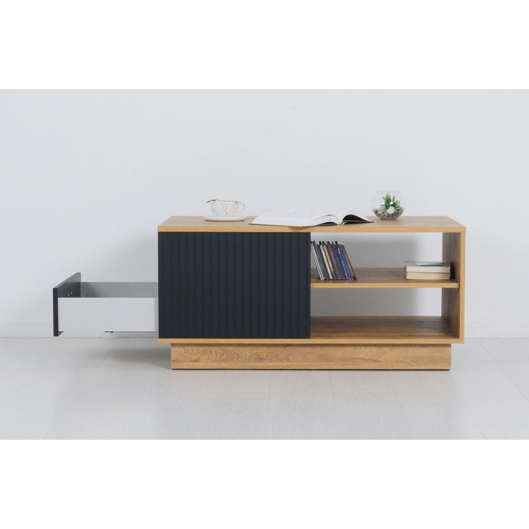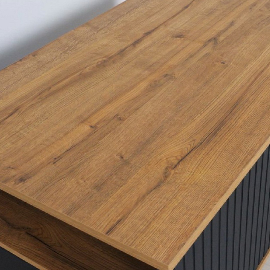 Vyniká rýhováním, které je stylové a velice moderní. Pod vrchní deskou je zásuvka s tichým otevíráním a dojezdem. Nechybí ani odkládací police na noviny a časopisy. Upevněno na soklu pro větší stabilitu nábytku.