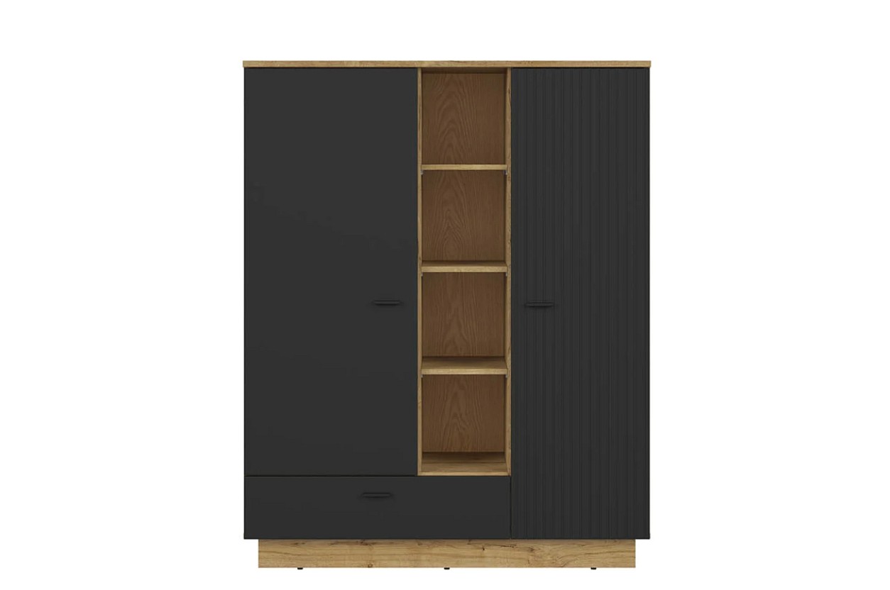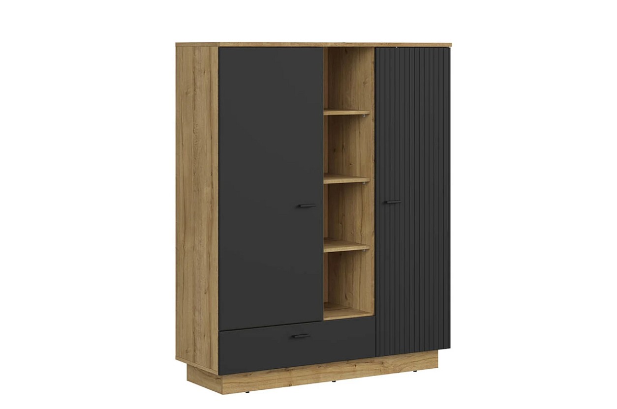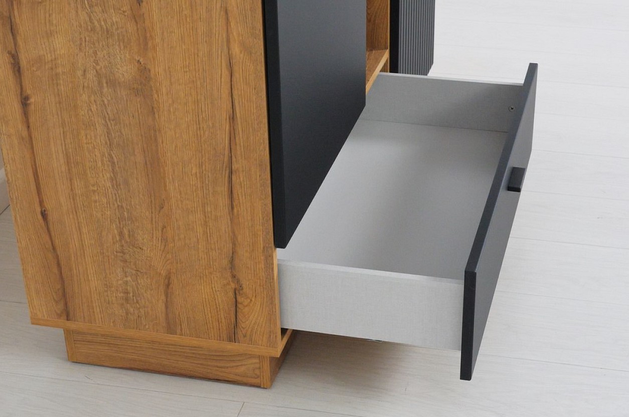 Má otevřenou část s policemi a uzavřenou část s dvířky za kterými jsou k dispozici rovněž police. Elegantní design podtrhuje moderní propojení barev dub waterford/černá a rýhovaní na dvířkách. Otevřené police vám skvěle poslouží k vystavení dekoračních předmětů nebo knih. Za uzavřenou část pak můžete umístit různé maličkosti. Ve spodní části se nachází šuplík s tichým dojezdem. Je tak zajištěn klidný a plynulý pohyb.