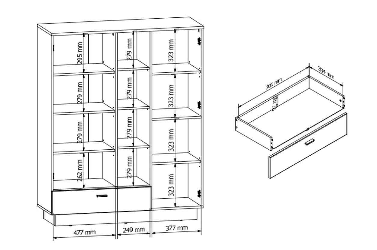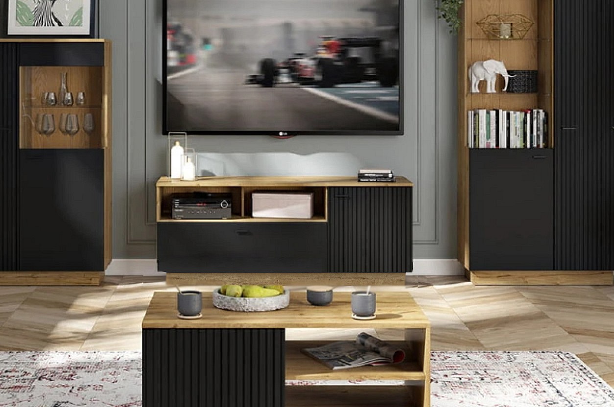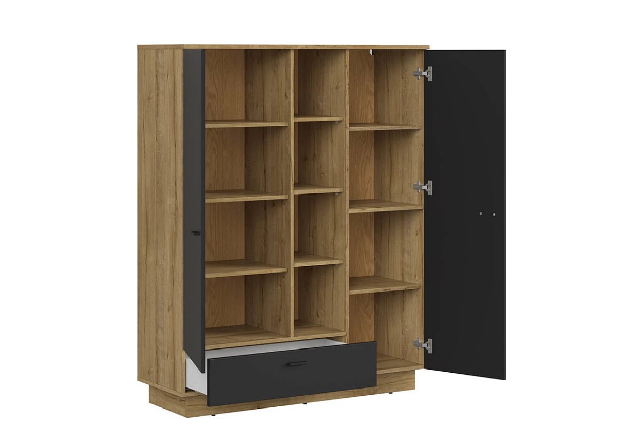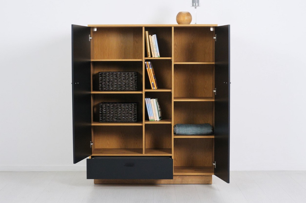 Má otevřenou část s policemi a uzavřenou část s dvířky za kterými jsou k dispozici rovněž police. Elegantní design podtrhuje moderní propojení barev dub waterford/černá a rýhovaní na dvířkách. Otevřené police vám skvěle poslouží k vystavení dekoračních předmětů nebo knih. Za uzavřenou část pak můžete umístit různé maličkosti. Ve spodní části se nachází šuplík s tichým dojezdem. Je tak zajištěn klidný a plynulý pohyb.