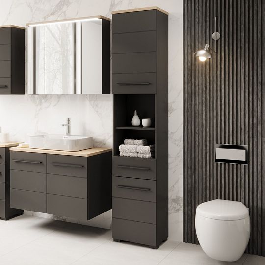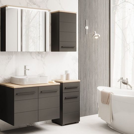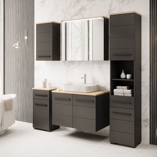 Vneste do své koupelny kus industrialismu. Pořiďte ji nábytkovou kolekci SHEFIELD. Jde o propojení černého matného korpusu a desek v barvě dub artisan. Tento moderní industriální styl zaujme svým zpracováním na první pohled. Jde o esteticky výraznou, ale praktickou kolekci, které nechybí úložné prostory. Jednotlivé prvky je možné mezi sebou vzájemně kombinovat a vytvořit tak originálně laděný domov.